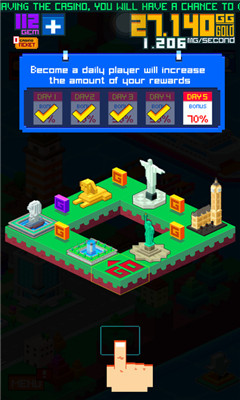 乍一看《世纪之城》就是一款像素城建游戏,建设和社交元素俱全。但在玩过一阵之后,你就会感到它涌动着一颗《比特币亿万富豪》以及《点杀泰坦》的心。首先玩家并不能指定房子建造的位置,策略也只有一种:钱生钱。赚钱的办法有两种:一个是做苦力挖泥土——没说的,苦力嘛肯定是让你点点点;第二个则是造建筑,它们可以凭空生出钱来。对应《点杀泰坦》的话,挖土方就是点英雄,而那些建筑则是雇佣兵。