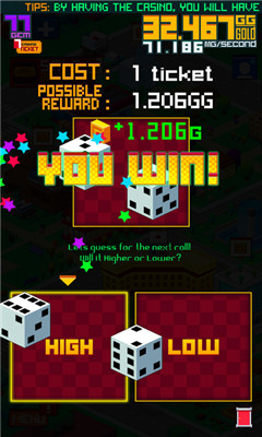 挖土的时候也会有各种彩头,只要点击够快就可以把宝箱送出地面;另一种抽奖箱则藏着各种好事坏事,幸运的话会有让金钱加N倍的Buff,坏的也许会直接扣掉三分之一的现金;城市里送来的东西也不坏,直升机每隔几分钟就会吊着宝箱在那瞎晃,每隔两小时会发一张入场券邀请你去玩猜大小。