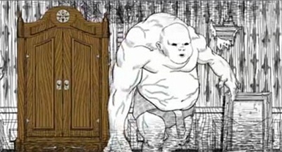 进入地下室,穿过很多洋娃娃的房间,一幅特殊的红色边框女性画, 向前,终于遇到大麻烦,一个巨大的怪物出现,躲进衣柜。
