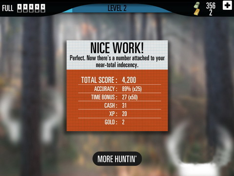 当玩家成功射击到猎物之后将会获得一定的分数,不过并不是所有的猎物都是可以一枪毙命的,例如像蚯蚓、小鸟等体型较小的猎物都可以被一枪毙命,但是体型较大的豆腐块可能就需要三到四枪才可以被射杀,当豆腐块受到攻击之后会因为受到惊吓而到处乱跑,此时玩家要想顺利射杀可就没有这么容易了,不过玩家也可以选择等待一段时间,豆腐块安定下来之后再射击,但是可别忘了,任务是有时间限制的。此外游戏当中还为玩家准备了多种不同的武器,从枪支到各种炸药一应俱全,玩家可以利用完成任务之后获取的金钱奖励对于武器系统进行升级,使得武器拥有更强的杀伤力,在完成任务的过程当中效率也会更高,对于分秒必争的任务来说这可是非常重要的。