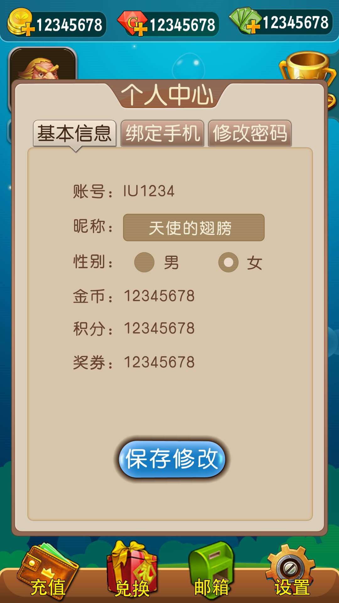 充值就是购买元宝、兑换就是把元宝兑换成金币、邮箱其实是发放奖励用的、设置可以调节音乐音效。