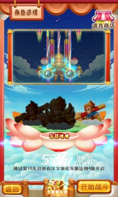 说明的是,选择法宝强化来增加角色的射击能力!如下图,点击屏幕角色左右滑动来切换新的角色,分别为石猴、美猴王、齐天大圣等等角色,新的角色需要玩家你钻石解锁开启!