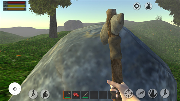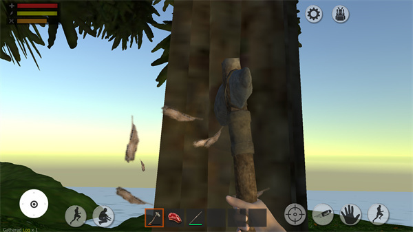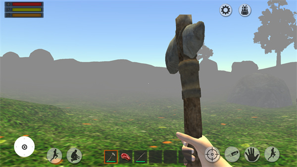 3、游戏的操作很简单,只要在物品栏选中想要使用的工具,再点击右侧的巴掌按钮即可进行各种劈、砍等操作。