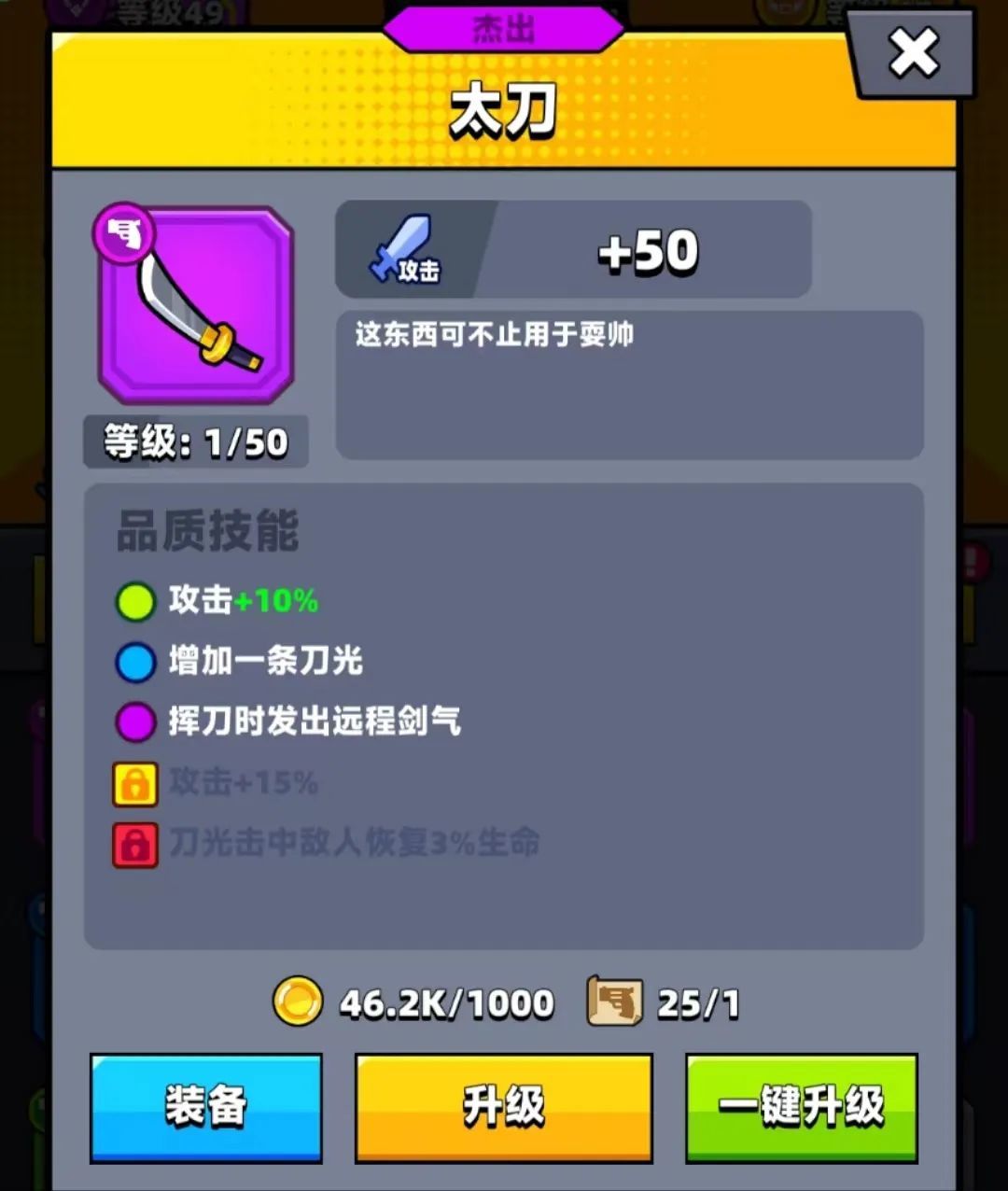 而且只要它的品质达到紫色时,就可以变为远程攻击武器了。它的攻击方式为向前后两个方向挥出刀光攻击敌人,实际上它的攻击范围还是挺大的。