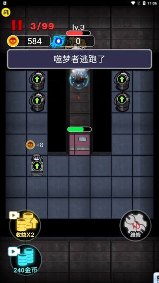 来躺平呀游戏中,玩家作为人类需要不断的发展经济从而抵挡嗜梦者的攻击,升级床可以提升自己的金币获取速度,升级门可以提升门的血量抵挡嗜梦者的攻击.........