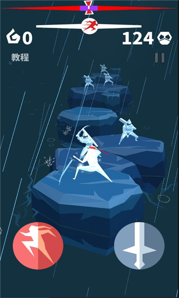 游戏中玩家可以按下攻击和跳跃两个按钮,当玩家前方为敌人时玩家需要按下攻击按钮,当玩家前方为空地时玩家需要按下跳跃按钮跃向前方。
