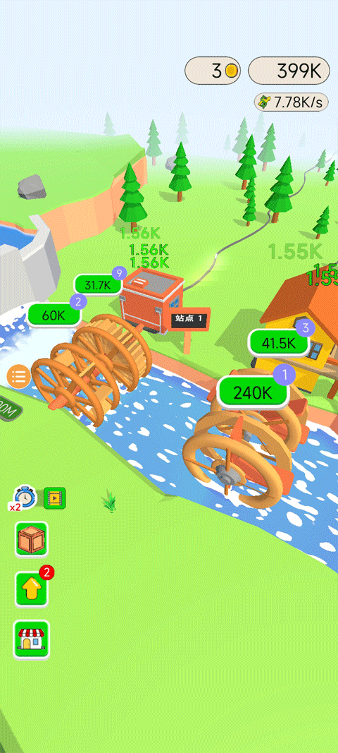 1、打开游戏,首先点击绿色按钮“2”,就能立马建造一个水力发电机。