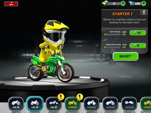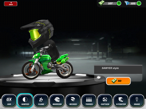 在游戏中玩家将驾驶着摩托车享受极限运动的乐趣,游戏中采用了卡通风格的画面设计,看起来角色的人设特点还是非常明显的,头部看起来非常大,这种画风看起来还是非常有趣的。此外游戏中也为玩家准备了许许多多不同的外观方案,除了车手本身有不同的选择之外,就连摩托车也有不同类型的车型可以选择,不同的摩托车属性都是不一样的,游戏中玩家的选择还是比较多的。