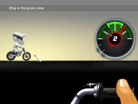 游戏中的操作还是非常简单的,在比赛开始前,玩家需要控制时速表上的指针保持在绿色区域里,只有这样玩家才可以保证自己的车手能够以完美状态起步。在行驶的过程中摩托车的加油是自动的,玩家完全不用做任何的操作,这一点还是十分方便的。而到了上坡需要腾空做花式动作的时候,在画面下方会出现一个蓄力条,而且蓄力条会自动进行蓄力,当蓄力到完美范围内的时候玩家点击屏幕即可让车手顺利的完成腾空、花式动作、落地等一系列的动作,若失误的话,车手落地之后可能会对速度造成一定的影响。